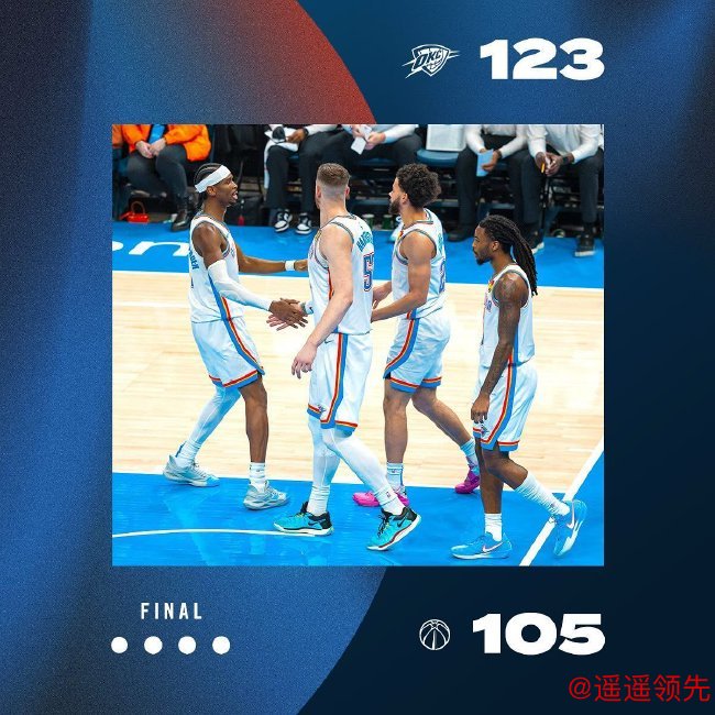 雷霆(23-5):亚历山大41分9篮板3助攻3抢断3盖帽、杰伦-威廉姆斯17分7篮板4助攻、哈滕16分11篮板3助攻、米切尔16分12篮板、卡鲁索2分4助攻